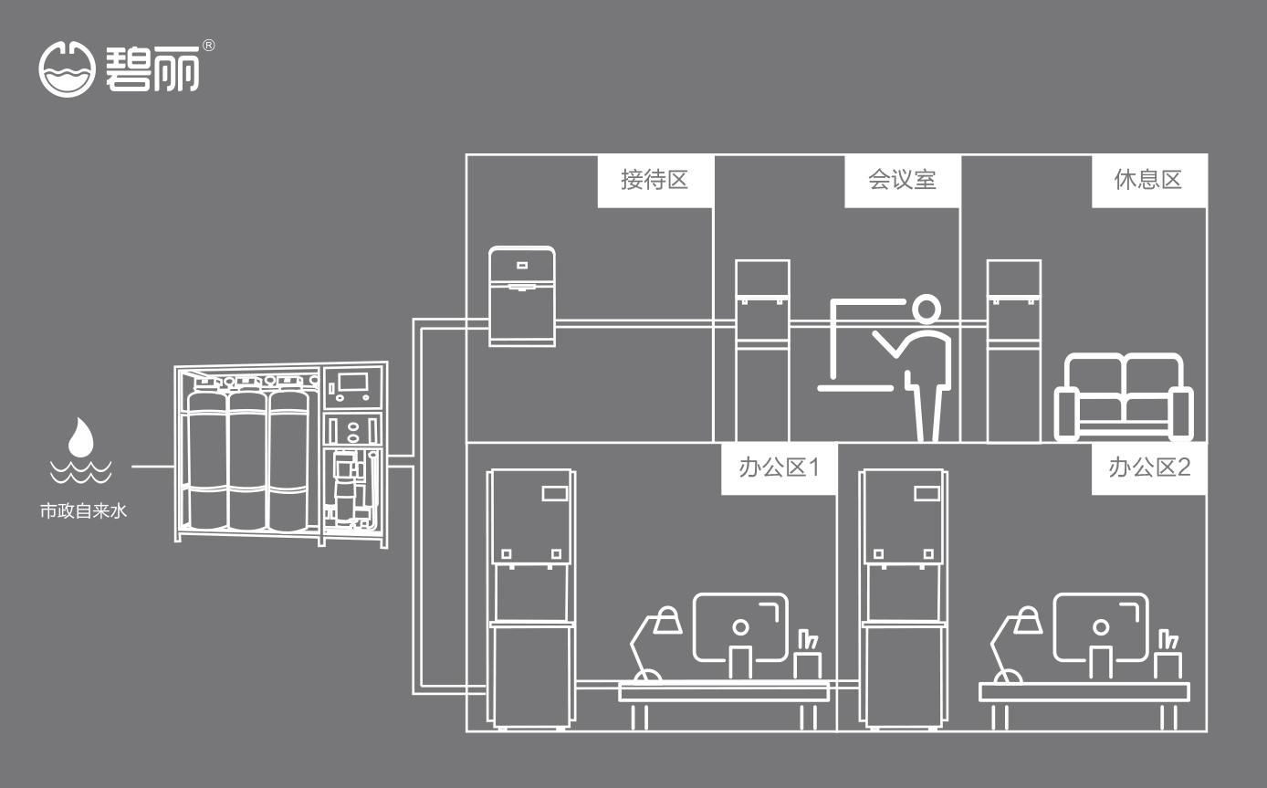 • 碧麗商用反滲透純水機將自來水集中處理后,把優(yōu)質(zhì)的純凈水通過專用的供水管道輸送到各飲水點;